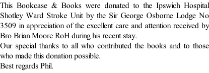 Royal Antediluvian Order Of Buffaloes Ipswich And District Provincial Grand Lodge GLE EVENTS UPDATE & ACKNOWLEDGEMENTS Bookcase donation to Shotley Ward by the Royal Antediluvian Order of Buffaloes Bro. Bernie Smith KOM PGP 2015 and Bro. John Sheppard ROH DPGP 2015 At the public investiture of the Provincial Grand Primo	on Saturday 21st March 2015 at Woodbridge October 14 We raised £550